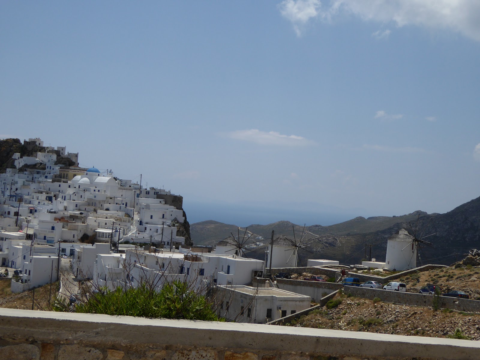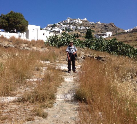 הדרך מתפתלת במדרגות רבות כמעט לכל אורכה. 2.5 ק”מ בעליה. בצל ממש נעים אבל הוא איננו… ובשמש חםםםם!!! כל הדרך אני מחכה להפתעה שכתובה על העיר הזו. ממתינה לאיזה וואו! שווה אבל…. לטעמי לתושבים כאן אין את החוש האסתטי שיש לתושבי קיאה או קיטנוס והם אינם מקשטים את בתיהם או הסמטאות. לא בציורים ולא בעציצים, פרחים או ירק. נכון שהיא גבוהה וחולשת מלמעלה על האי אבל פרט לכיכר קטנה, שניים- שלושה בתי קפה, וחנות אין שם משהו מיוחד. אז לימונדה לי וקפה ליוסי ומנוחה קלה וסוגרים את הפינה הזו. אנחנו נותנים לעיר הזו עוד חצי ק”מ של טיפוס בהר למצודה, על מנת שהיא תראה לנו בכל זאת, מה היא שווה. מוצאים עוד כיכר לפני בית העירייה ועוד שני בתי קפה לצידה והצלחנו “לחסל” גם את עיר הבירה הפצפונה.